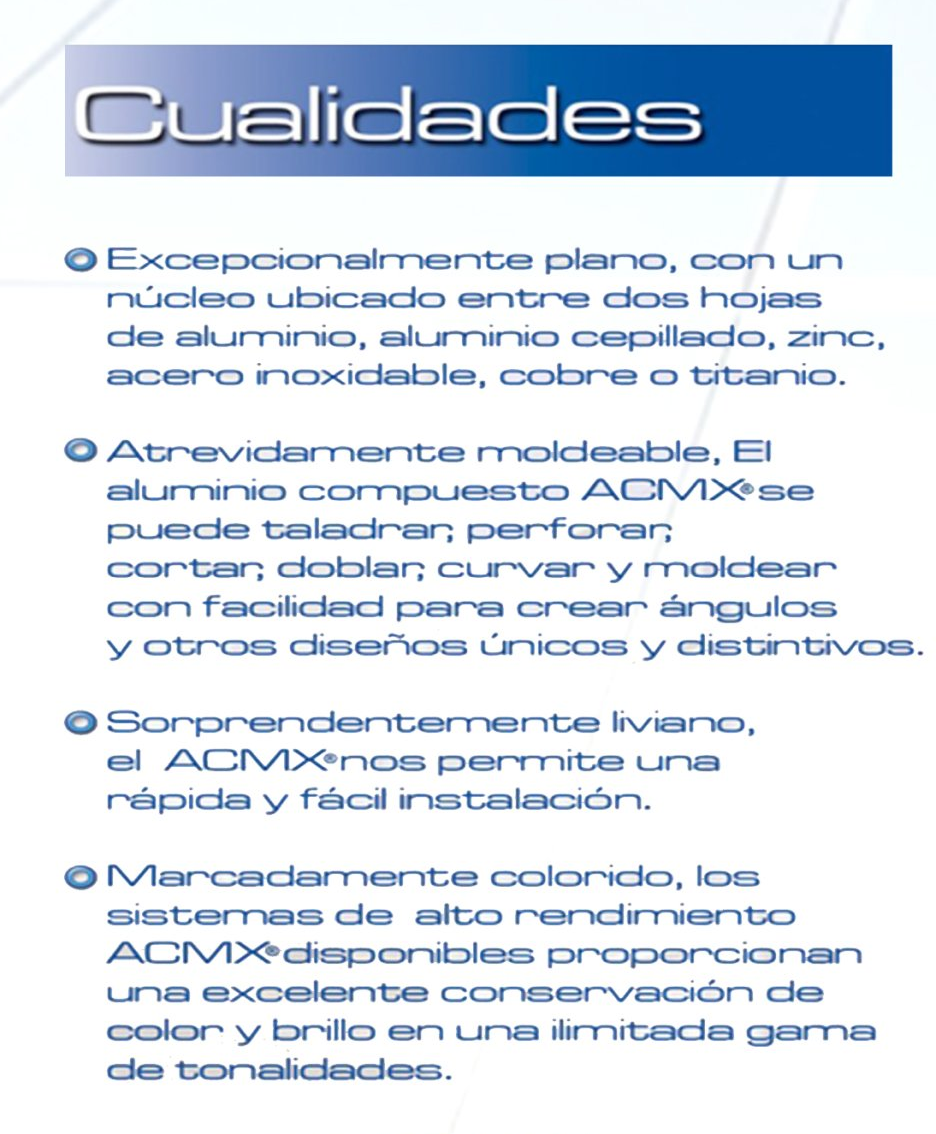 Las láminas de ACM (Aluminium Composite Material), también conocidas como ACP (Aluminium Composite Panel), están formadas por dos caras de aluminio y un núcleo de polietileno, se pueden utilizar en: